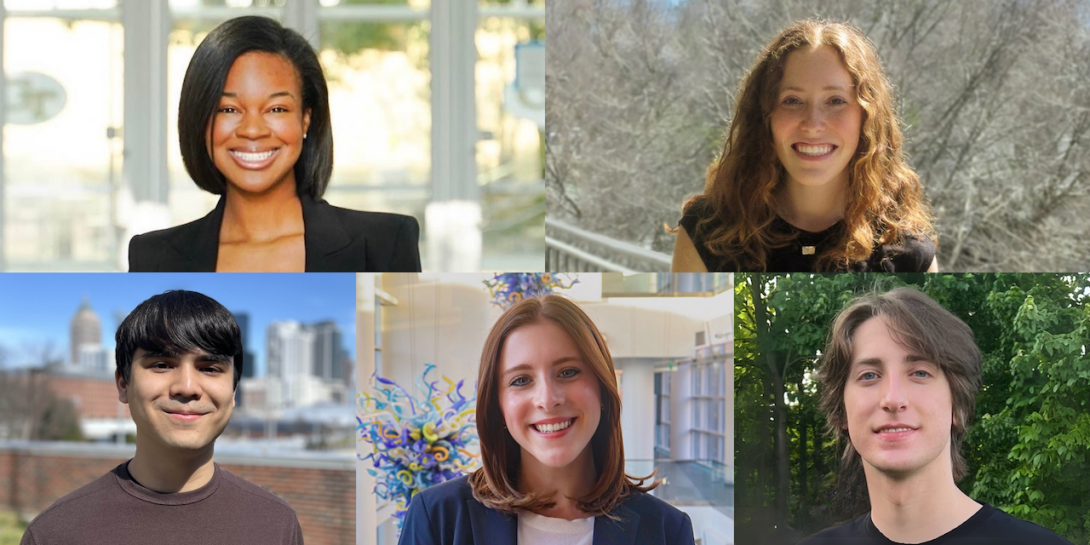 This year's Provost's Academic Excellence Award recipients include Alexander Divoux from the College of Sciences, Isabella Baker from the College of Design, Camryn Bryant from the Ivan Allen College of Liberal Arts, Aubrey Charron from the Scheller College of Business, and Andrew DiBiasio from the College of Computing.