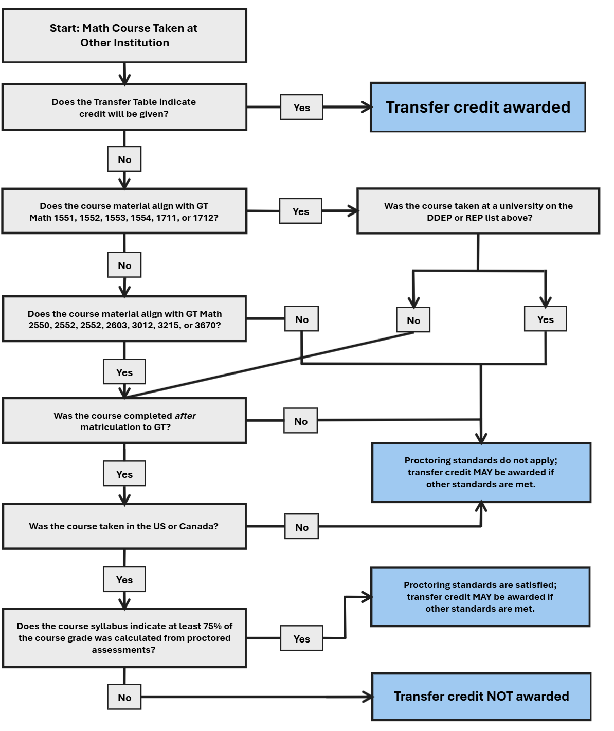 In order to transfer math credits from other accredited colleges and universities to Georgia Tech, the School of Mathematics sometimes requires proof that at least 75% of the course grade was computed from proctored assessments. This requirement will be enforced when EVERY condition below has been met: